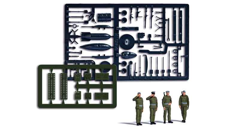 Солдаты (4 неокрашенных фигурки, инструменты, бочки, бомбы и др.), 1:87, армия ГДР