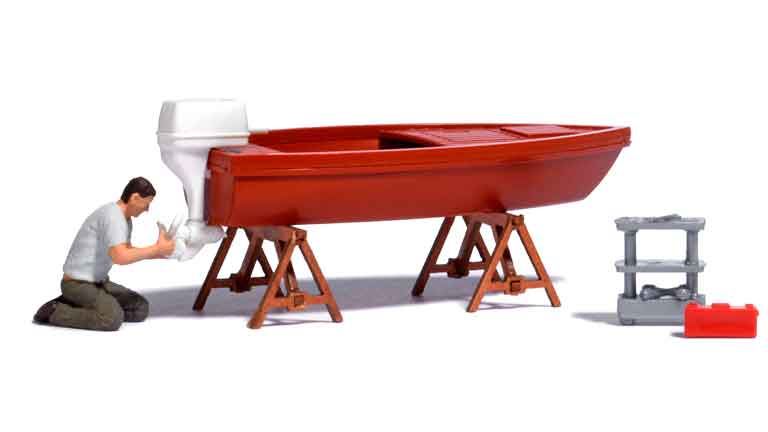 Коллекционный набор «Ремонт лодки (механик, лодка, стенды, тележка и ящик)» из пластика рекомендуется для диорам в масштабе 1/87 и железнодорожных макетов типоразмера Н0 (1:87). Окраска модели не требуется.