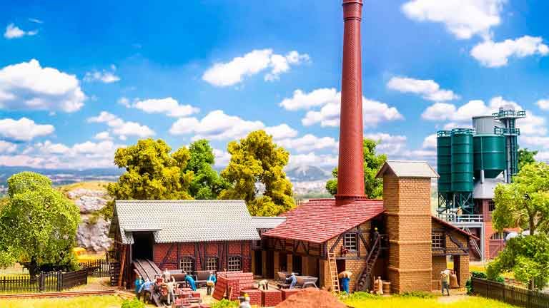 Набор состоящий из главного здания с камерами сгорания, печи и дымохода, а также сушильного сарая для заготовок кирпича. С рельсовыми путями и многочисленными декоративными элементами, такими как ручные и тачки, тележки, лестницы, штабеля кирпича и многое другое.