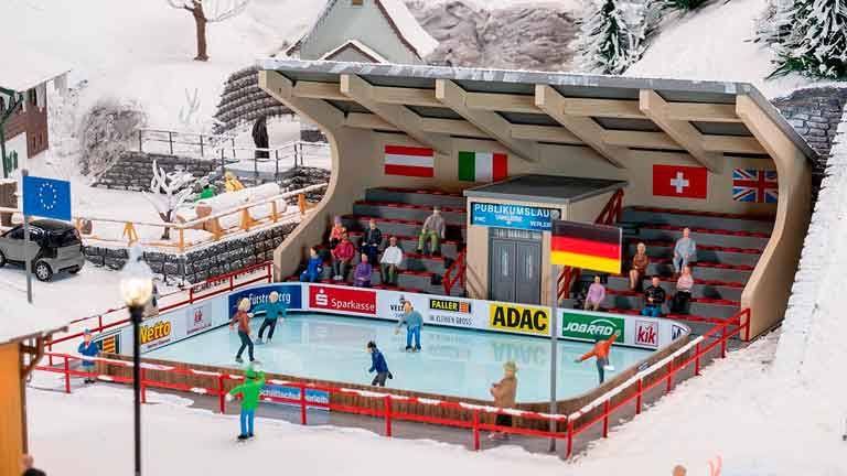 Пять миниатюрных фигуристов (подвижные) грациозно скользят по ледяной поверхности и оживляют зимние декорации. Над катком возвышается трибуна с местами, с которых можно наблюдать за происходящим на катке. Многочисленные национальные флаги украшают стены и мачты. Так и хочется пристегнуть коньки и присоединиться!