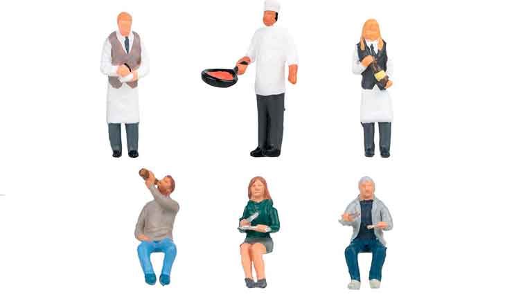 Масштабный модельный набор из 6 окрашенных фигурок «Официанты и посетители ресторана» из пластика рекомендуется для диорам в масштабе 1/87 и железнодорожных макетов типоразмера Н0 (1:87). Окраска фигур не требуется (цвет, ассортимент и дизайн может отличаться от представленного на иллюстрации).